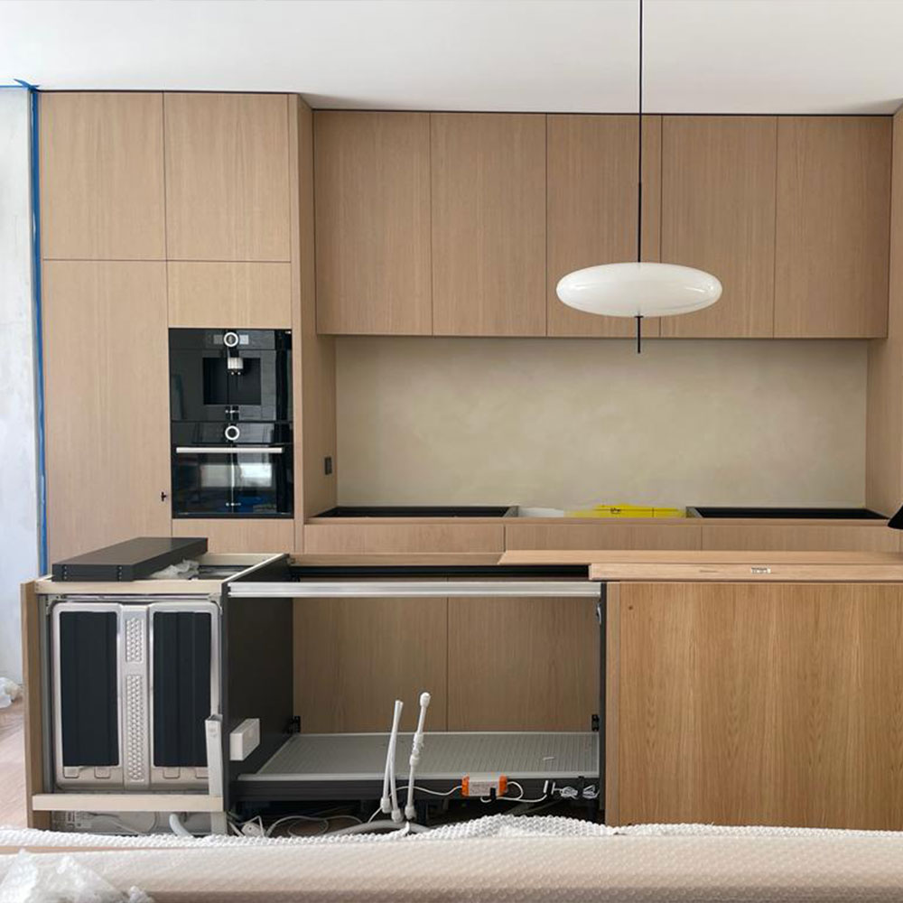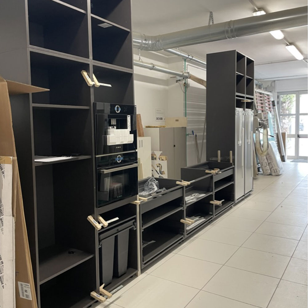 Per sfruttare a pieno tutto lo spazio disponibile, il nostro team disegna per il cliente una cucina ad Hoc. Le colonne a soffitto, i pensili e le basi, sono state realizzate minimizzando gli sfridi ed utilizzando millimetricamente tutto lo spazio. Quest’aspetto progettuale crea un connubio fra funzionalità ed estetica, in cui il gioco fra pieni e vuoti è sottolineato dalla pulizia di linee precise.