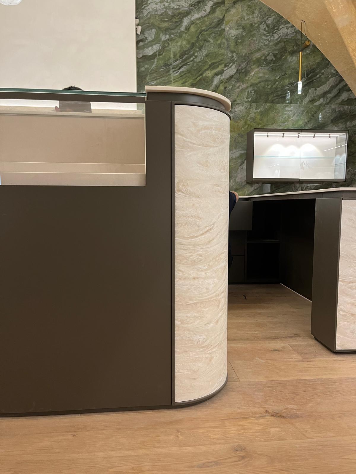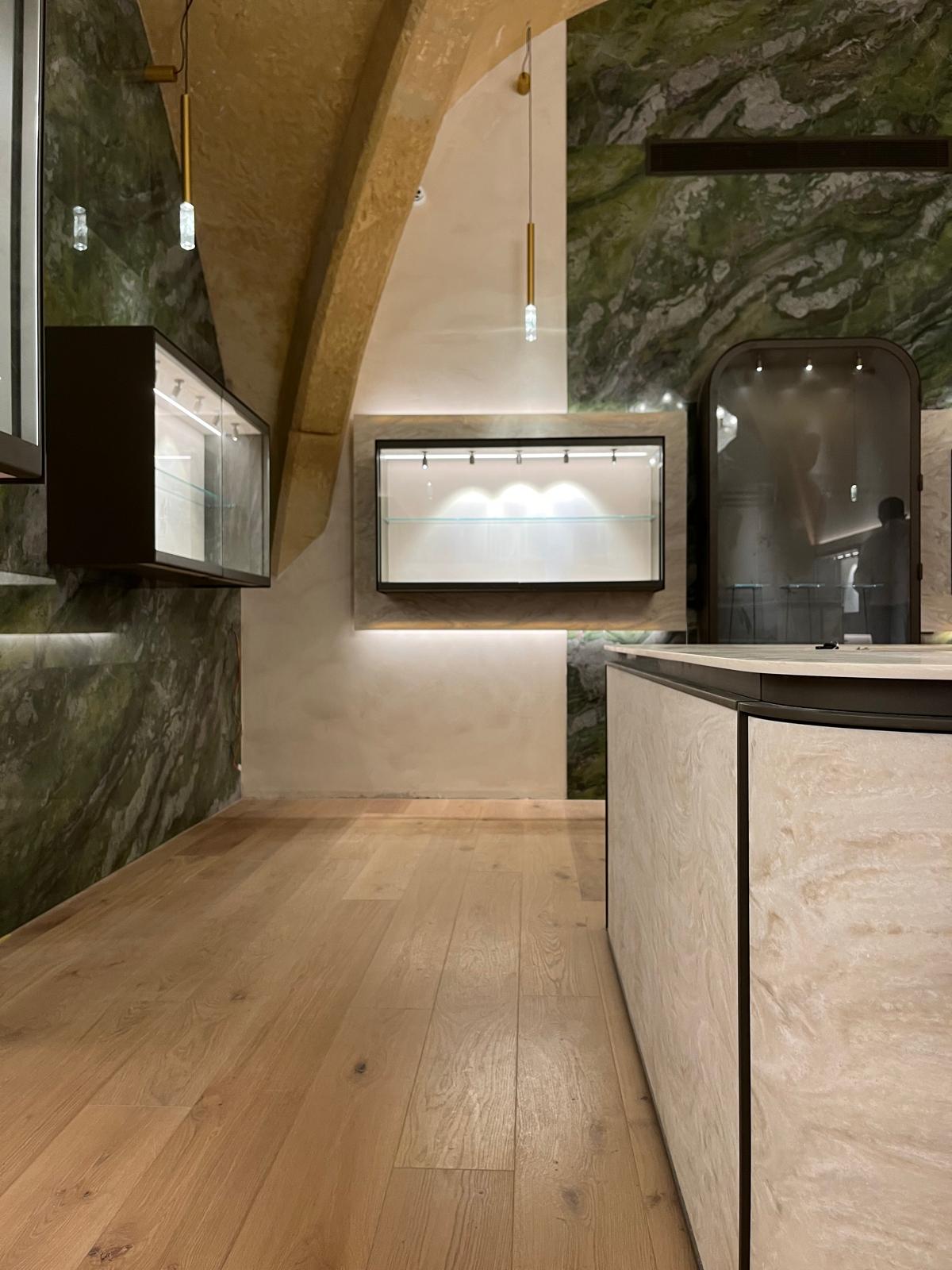 Ogni elemento è stato progettato per integrarsi con le forme della stanza, che conserva lo stile architettonico antico tipico del centro storico della Valletta. Le superfici in Corian, levigate alla perfezione, offrono una modernità discreta, mentre i dettagli metallici aggiungono un tocco di sofisticata contemporaneità. Il marmo, simbolo di lusso senza tempo, si fonde con il calore del legno per creare un ambiente accogliente e raffinato. Un’attenzione particolare è stata riservata allo studio dell’illuminazione, progettata per valorizzare al meglio gli orologi esposti. Luci calibrate e giochi di ombre sono stati studiati per esaltare ogni dettaglio degli orologi di lusso, creando un’atmosfera che invita i clienti a immergersi nella bellezza e nella precisione dei segnatempo.